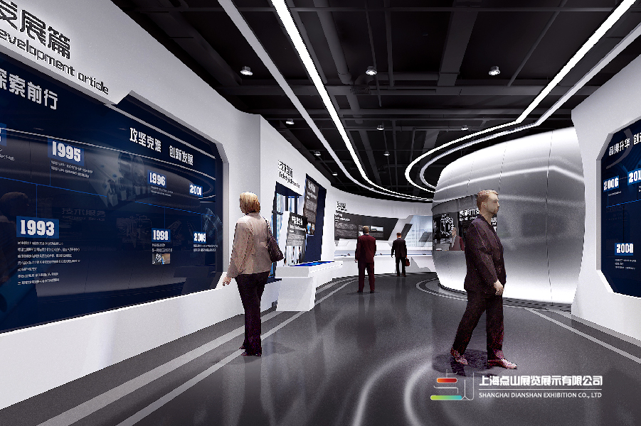 展廳包含金輪企業(yè)文化篇、發(fā)展篇、技術創(chuàng)新篇、服務篇、成果篇和未來篇共6個篇章。設計師汲取企業(yè)logo、企業(yè)產品以及跟產品相關的織線為主要元素,是整體的空間更加豐滿生動。其中服務篇是整個展示空間中的重中之重,我們在整體造型上結合企業(yè)產品的特性及造型,將其打造成相對圍合的獨立空間,凸顯企業(yè)核心的地位,呈現(xiàn)科技力量凝聚一體的強大氣場?,F(xiàn)場采用針布機實物和多媒體結合展示,可以讓參觀者直觀感受梳理器材發(fā)揮的核心作用。