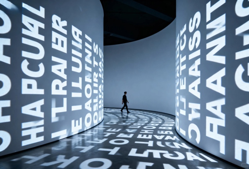 4. 空間化:構建文字的三維迷宮,文字作為隔斷或結構,用大型立體字構成空間的分隔墻、通道或頂棚,文字本身成為建筑元素。 沉浸式文字場域:打造一個被文字完全包裹的空間,如: “文字雨”:天花板不斷“落下”緩緩飄動的文字。 “文字森林”:無數(shù)懸掛的透明亞克的優(yōu)點上印有文字,隨風輕擺。 “回音壁”:弧形墻面刻滿文字,同時具有聲學反射效果,低語可被清晰聽到。